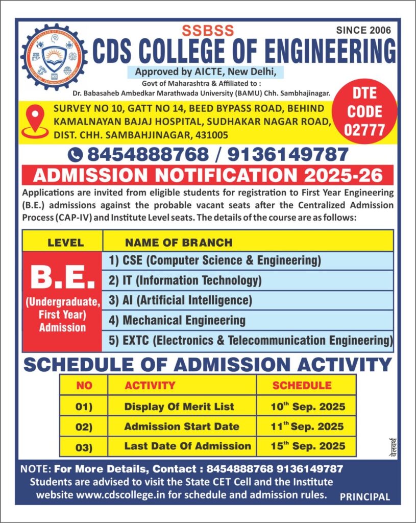CDS College of Engineering Approved by All India Council for Technical Education (AICTE), CDS College of Engineering offers comprehensive assessment and information on various engineering disciplines, including – Computer Science and Engineering (CS), Information Technology (IT), Artificial Intelligence (AI),Mechanical Engineering (MECH),Electronics and Telecommunication (EXTC). Our website provides detailed insights into academic programs, admission processes, placements, facilities, and research initiatives, serving as a one-stop destination for prospective students, parents, and industry partners to explore and stay informed about our offerings and opportunities.